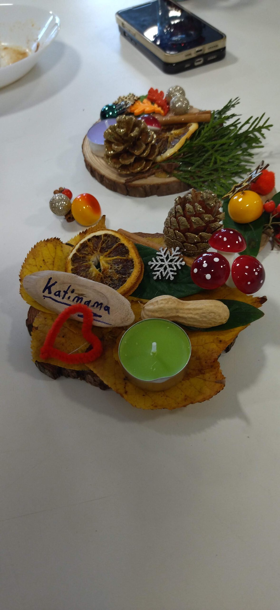 Adventi asztali és ajtódísz készítés, őszi termések festése, üveg mécsestartó festés, dekorálás, hűtőmágnes, képeslap készítés.