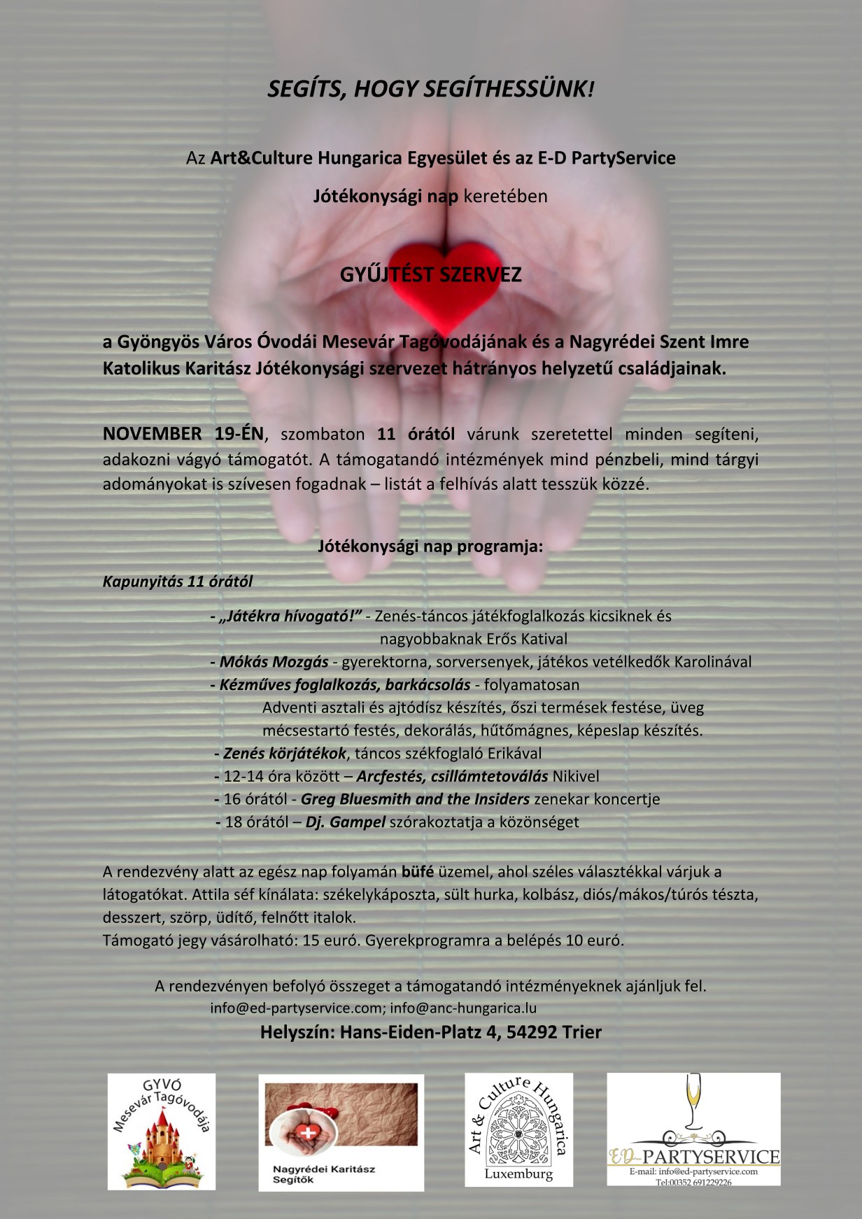 Az Art&Culture Hungarica Egyesület és az E-D PartyService Jótékonysági nap keretében GYŰJTÉST SZERVEZETT a Gyöngyös Város Óvodái Mesevár Tagóvodájának és a Nagyrédei Szent Imre Katolikus Karitász Jótékonysági szervezet hátrányos helyzetű családjainak.