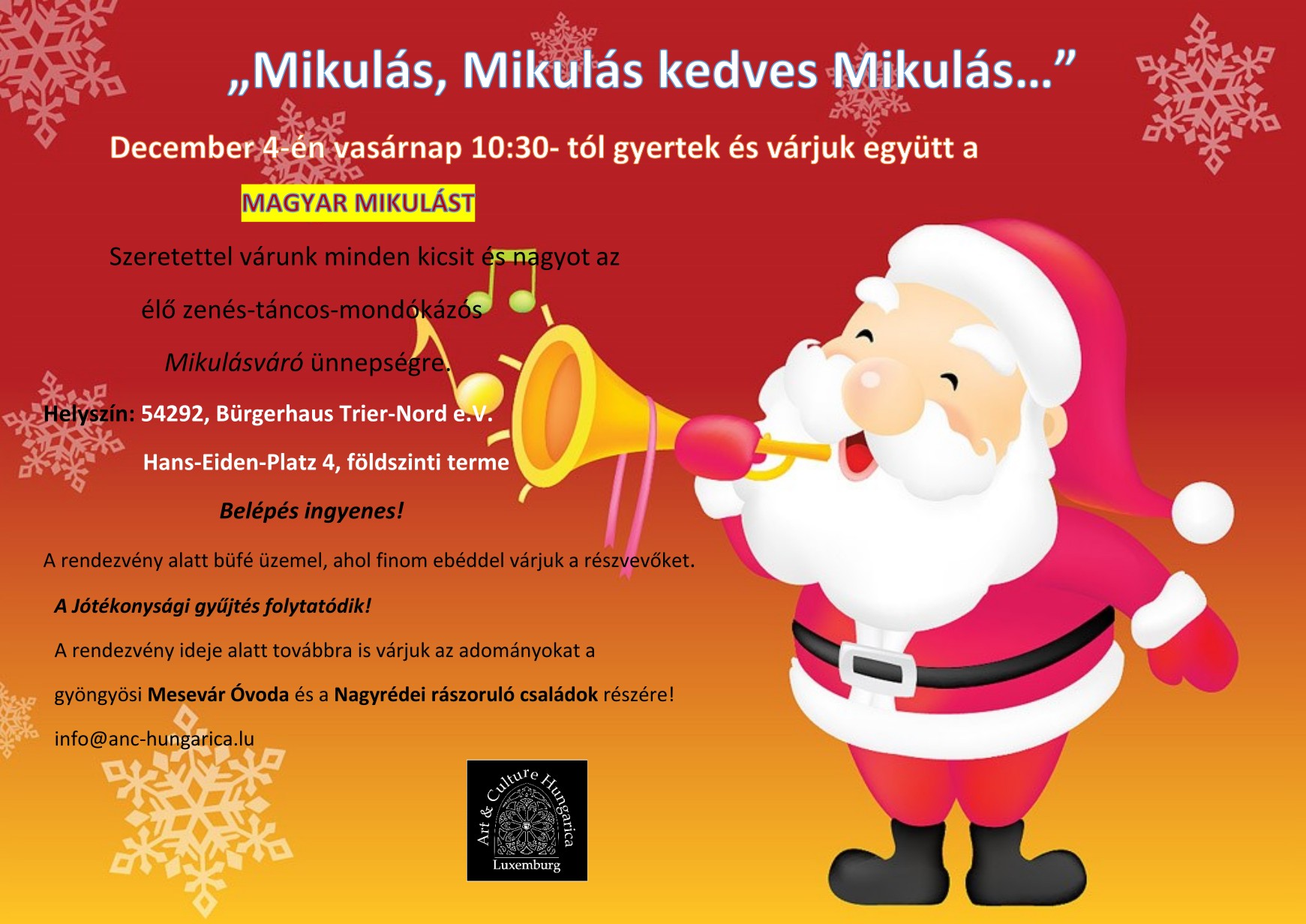 Mikulásváró ünnepségre.Helyszín: 54292, Bürgerhaus Trier-Nord e.V. Hans-Eiden-Platz 4, földszinti terme